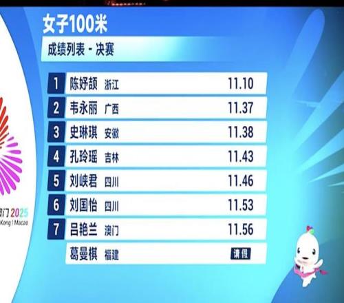 不过,在全运会赛场,陈妤颉这位天才少女,又带给了人们惊喜,在100米比赛她创造了神迹。陈妤颉预赛跑出11秒39,半决赛跑出11秒33。非常遗憾的是,梁小静因伤退出了100米比赛,连预赛都没参加。葛曼棋虽然跑了预赛和半决赛,但是因伤退出决赛。