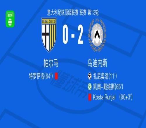 北京时间11月29日,意大利足球顶级联赛第13轮,帕尔马主场迎战乌迪内斯。比赛中,贝尔托拉送出助攻,扎尼奥洛接球后冷静施射破门,为乌迪内斯取得领先。随后,帕尔马球员特罗伊洛因犯规被直接罚下,球队陷入人数劣势。紧接着,乌迪内斯获得点球机会,凯南-戴维斯主罚命中,将比分扩大。比赛临近结束前,乌迪内斯教练组成员Kosta Runjaić因不当行为被出示红牌。最终,乌迪内斯客场以2比0战胜帕尔马。