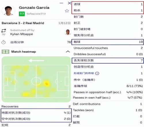 与巴萨的西超杯决赛上,贡萨洛6次一对一对抗输了5次,仅仅只有19次触球就丢球权7次,这样的数据也充分说明了他的问题。