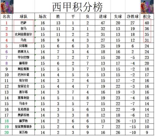 西甲最新积分战报马竞2连败开始掉队巴萨6连胜再多皇马4分