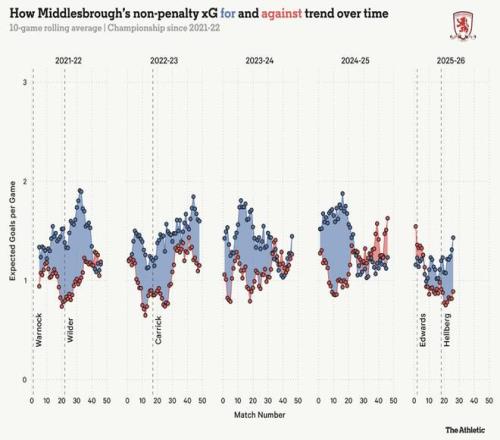 在英冠执教往往意味着不断应对变动,有天赋的球员会被资金更雄厚的俱乐部挖走,打乱精心构建的战术计划,迫使教练不断重新调整。卡里克在三年执教期间失去了几名关键球员,包括首赛季的英冠最佳射手阿克蓬。正如下面预期进球(xG)图表显示的那样,米德尔斯堡在攻防两端的基础数据在他执教末期明显下滑。